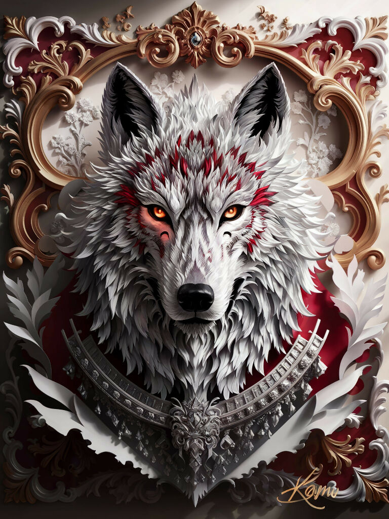 A highly intricate paper-cut artwork featuring the majestic head of a wolf. The wolf's fur is meticulously crafted in overlapping layers of fine paper, blending tones of white, silver, and crimson red. The wolf's piercing glowing amber eyes radiate intensity, while its detailed facial expressions reflect wisdom and strength.