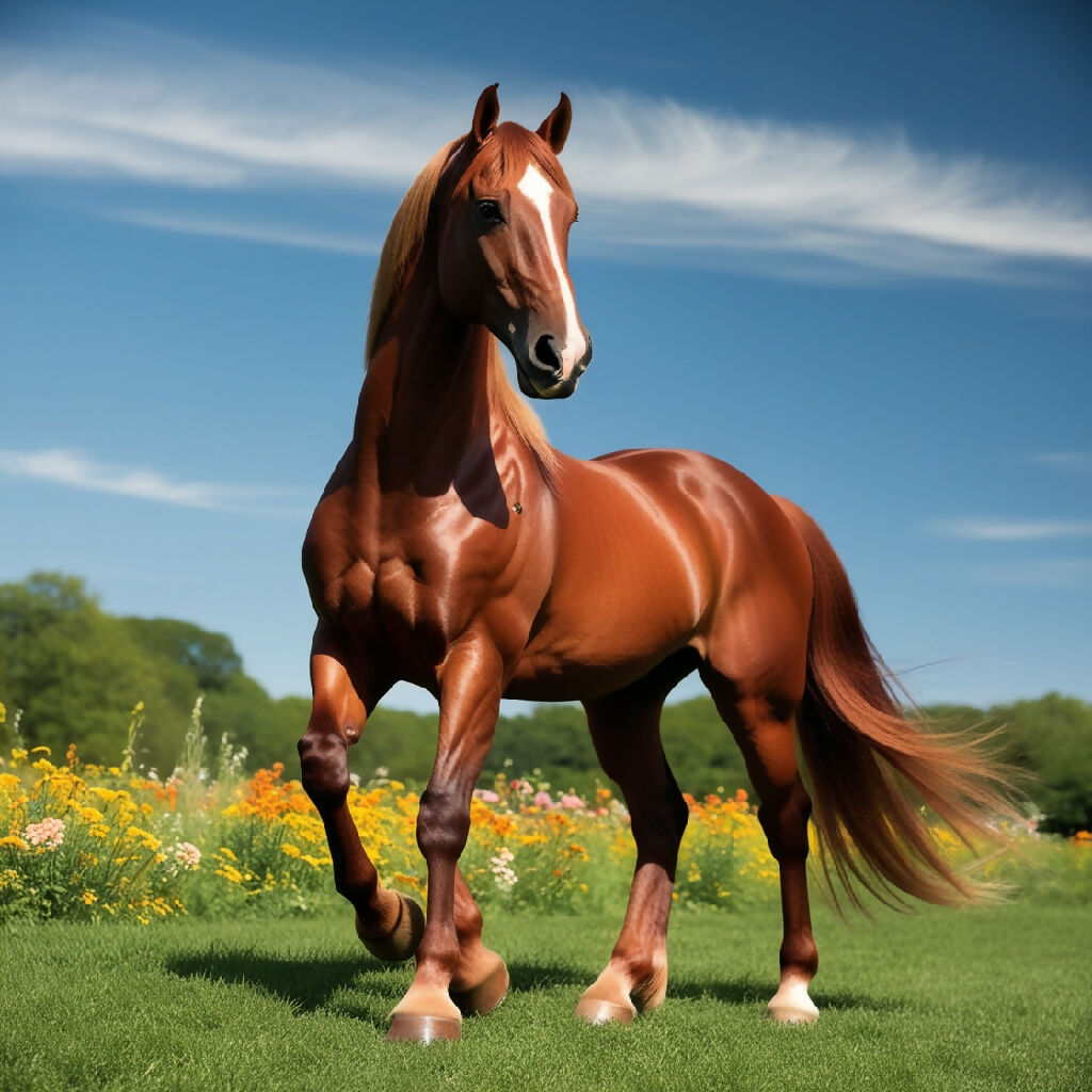 A regal horse with a shiny chestnut coat stands proudly in a vibrant, flower-filled field. The horse's muscular build is accentuated by the sunlight, highlighting its powerful yet graceful stance. A white stripe runs down its face, adding a striking contrast to its deep chestnut color. The background features a clear blue sky with wispy clouds and lush green trees, creating a serene and picturesque setting.