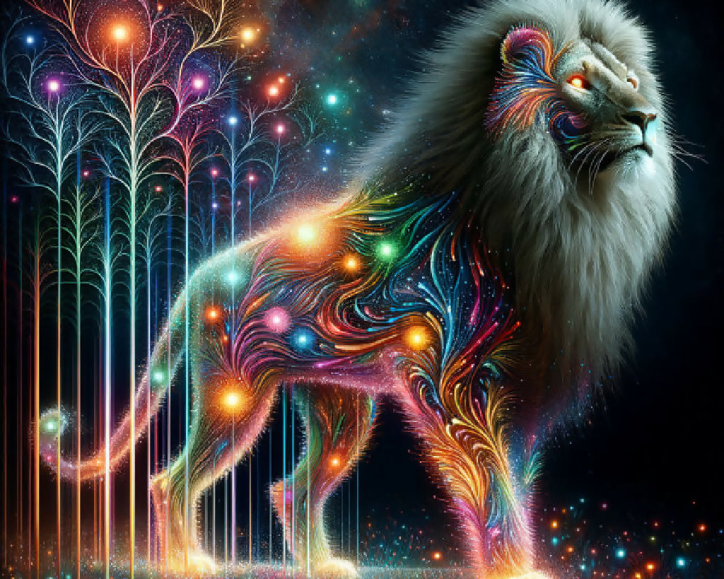 vibrant, cosmic lion illustrated with neon colors against a dark background, surrounded by stylized, glowing flora and faunal elements