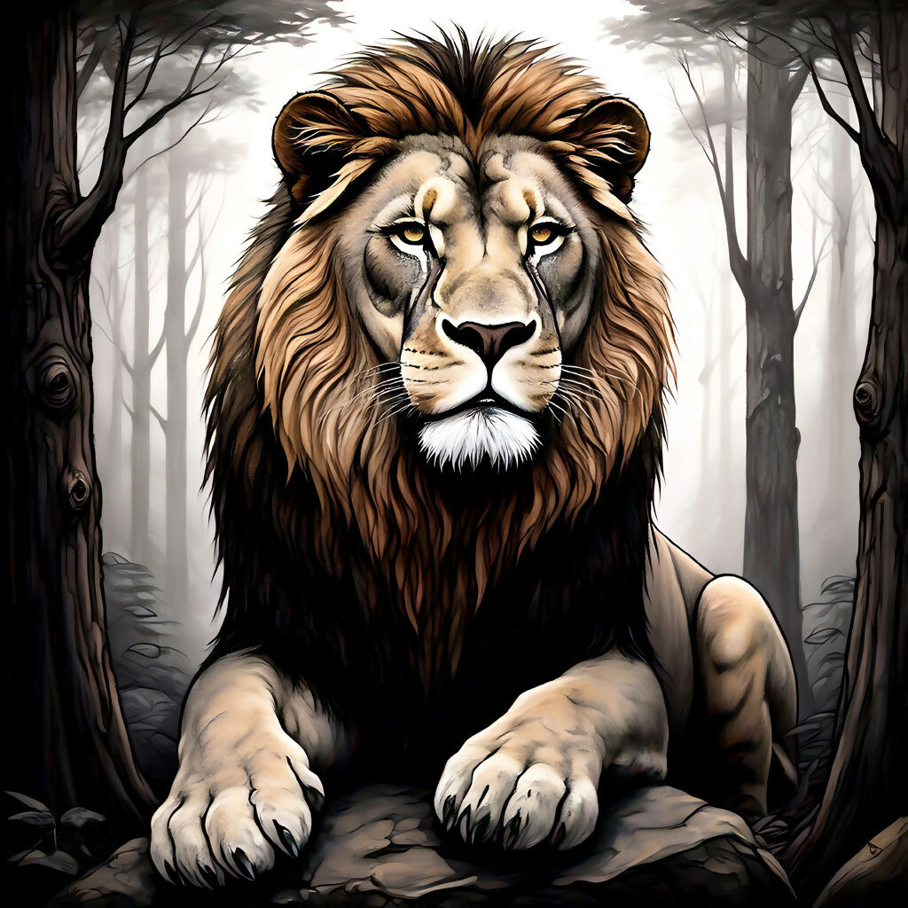 This stunning AI-generated artwork features a majestic lion resting in a mystical forest. The lion's regal presence is captured with intricate details, from its powerful paws to its piercing eyes. The forest backdrop adds an ethereal quality, making this piece a captivating addition to any art collection. Perfect for nature and wildlife enthusiasts, this artwork brings the beauty and strength of the wild into your home.