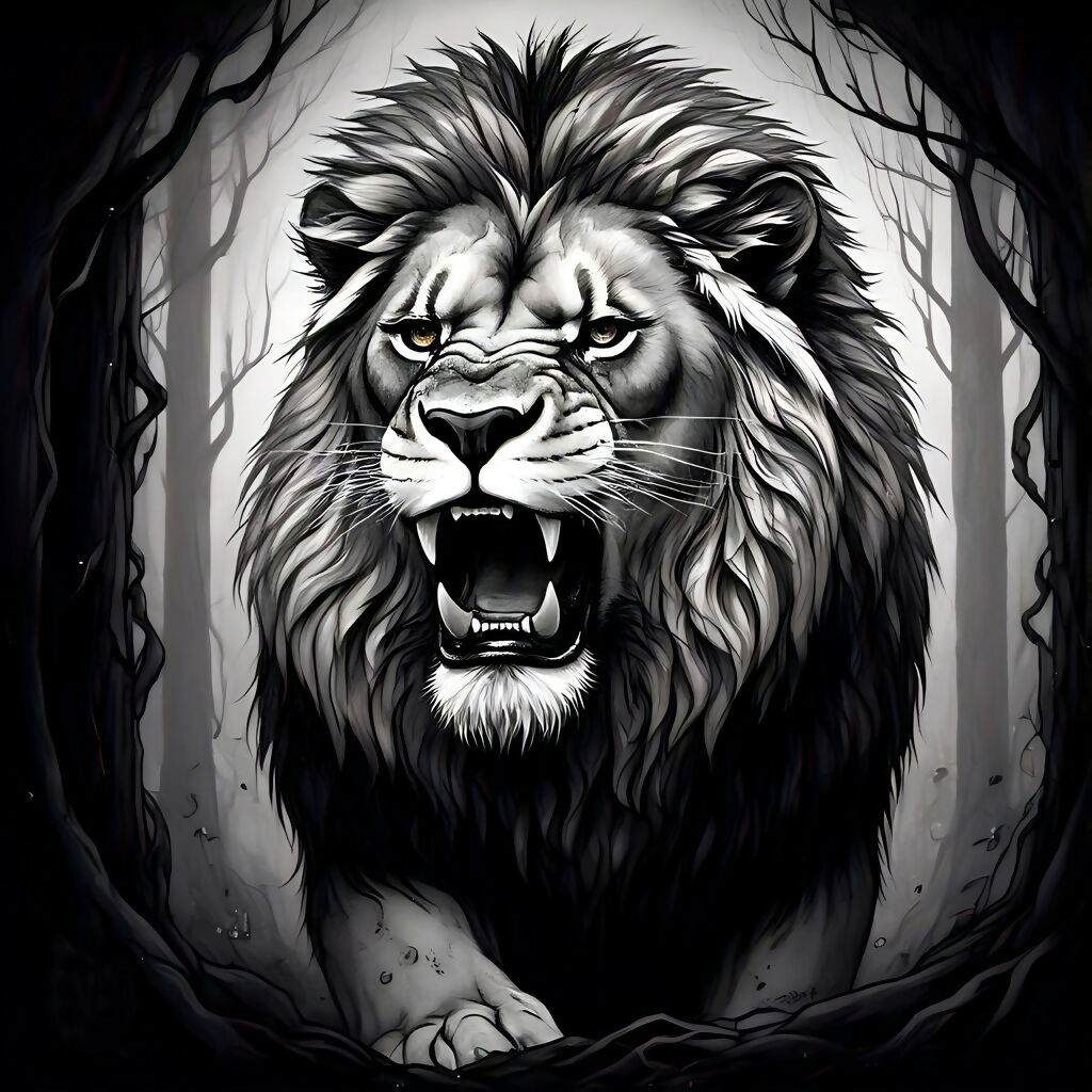 Experience the raw power and majestic beauty of the king of the jungle with this stunning AI-generated artwork. Featuring a fierce lion roaring amidst a dark, mysterious forest, this piece captures the essence of nature's grandeur and the untamed spirit of wildlife. Perfect for animal lovers and art enthusiasts alike, this captivating image will add a touch of wild elegance to any space.