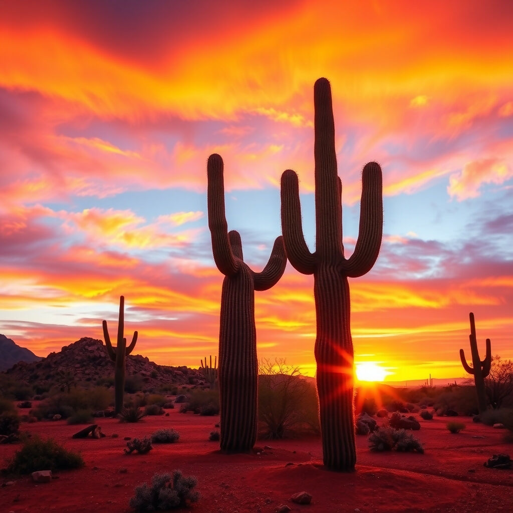 Iconic saguaro cactus stands tall in the Arizona desert as a spectacular sunset paints the sky with brilliant shades of orange, pink, and gold. The dramatic silhouette creates a perfect southwestern scene, with scattered cacti dotting the rocky terrain. A breathtaking moment capturing the raw beauty of desert wilderness.