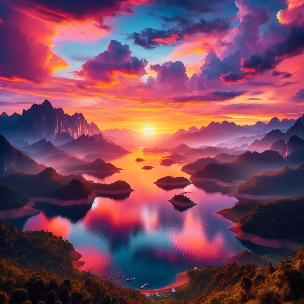 A breathtaking sunset unfolds over a calm lake, surrounded by towering majestic mountains. The sky bursts into a vivid display of colors — rich oranges, deep purples, and soft pinks — mirrored perfectly in the still waters below. The tranquil atmosphere and natural beauty make this scene both peaceful and awe-inspiring.
