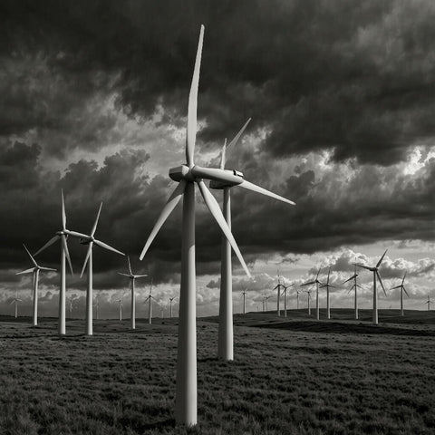 Capture the essence of sustainable energy with “Majestic Wind Farm,” a fine art photograph that showcases the towering grace of wind turbines against a powerful, cloud-filled sky. This monochrome masterpiece highlights the beauty of renewable resources and evokes a sense of hope for a cleaner future.