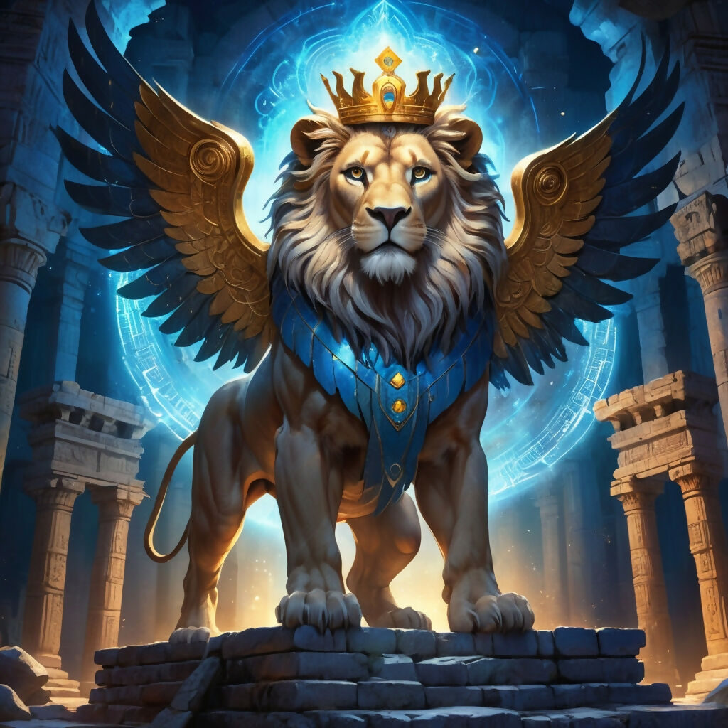 A breathtaking fantasy artwork featuring a regal lion adorned with a golden crown and magnificent wings, standing proudly amidst ancient temple ruins. The glowing blue aura and intricate details evoke a sense of power, wisdom, and mythological grandeur. Perfect for fantasy art lovers, animal art collectors, and anyone seeking a bold, inspiring centerpiece for their space.