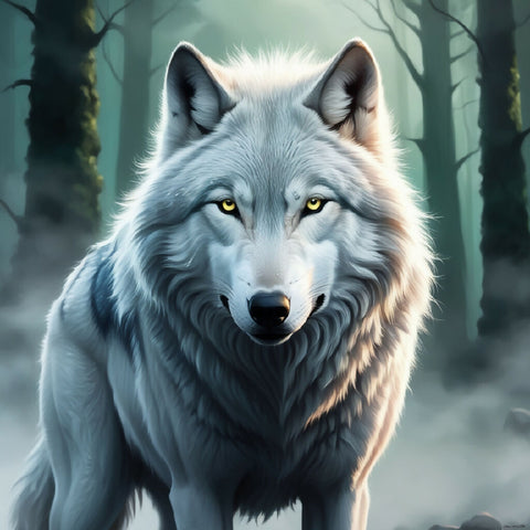 A majestic wolf rendered in vibrant digital painting, its thick, snow-white fur glistening with subtle texture, set against a misty, emerald-green forest backdrop, evoking a sense of mystery and wonder. The wolf's piercing yellow eyes gleam with an inner intensity, as if illuminated from within, while its sharp features and powerful physique exude strength and agility. Soft, warm light filters through the atmosphere, casting dappled shadows and imbuing the scene with a sense of enchantment and cinematic realism. in short