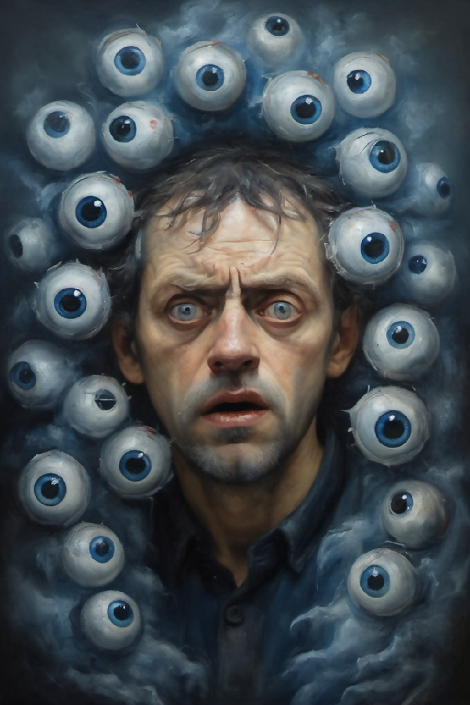 A depiction of anxiety and social phobia, the feeling of being watched and judged at every step. A face that reflects what many keep silent.