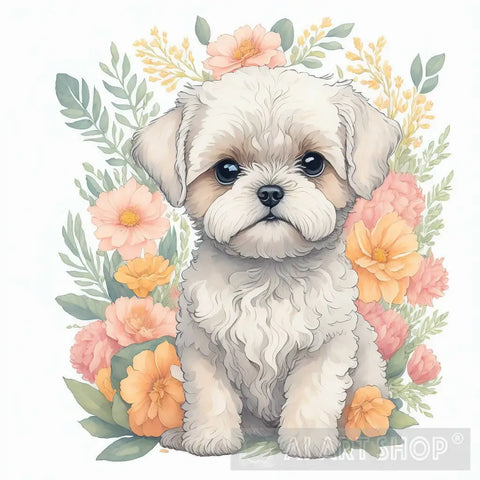 A Maltese puppy sitting with Summer flowers. peach and yellow flowers.