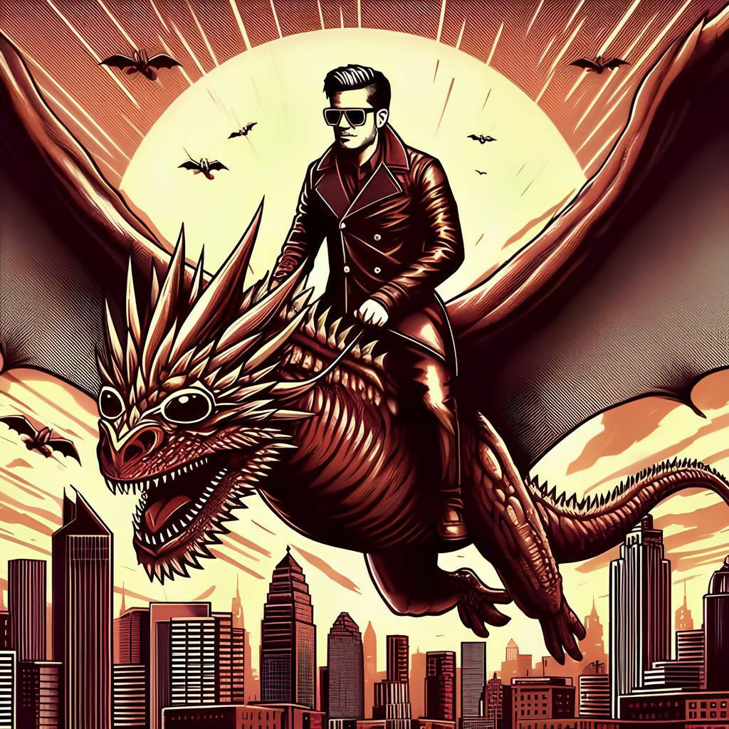 Experience the thrill of fantasy in this artistic image of a man soaring through the skies on a dragon, enhanced with bold posterization effects. A powerful blend of adventure, surrealism, and striking visual style.