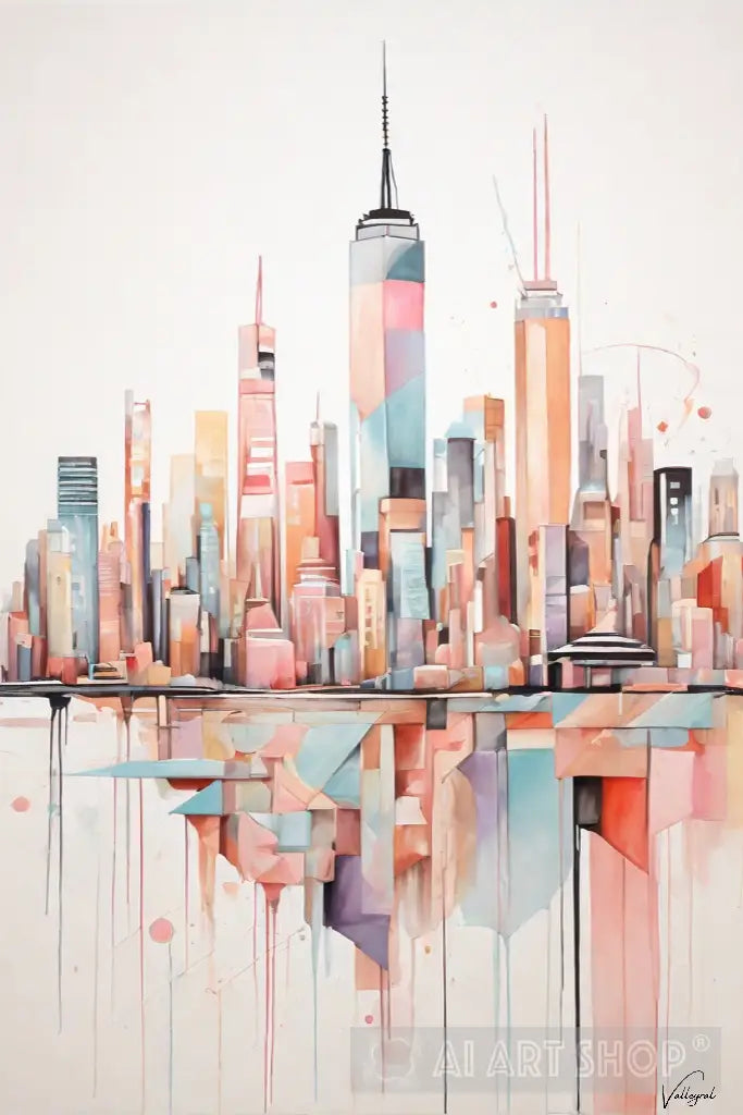 Within the ethereal strokes of pastel pinks and blues, the Manhattan skyline unfurls in abstract grace. Each line and corner whispers the tale of a city that never sleeps, a symphony of steel and dreams. Amidst soft hues, skyscrapers rise like giants, their silhouettes dancing against the canvas of dawn or dusk. The pastels evoke a sense of serenity, a tranquil contrast to the bustling metropolis they portray. It's a visual poem of urban elegance, where the vibrant energy of New York City is distilled into gentle shades, inviting contemplation and wonder in equal measure.