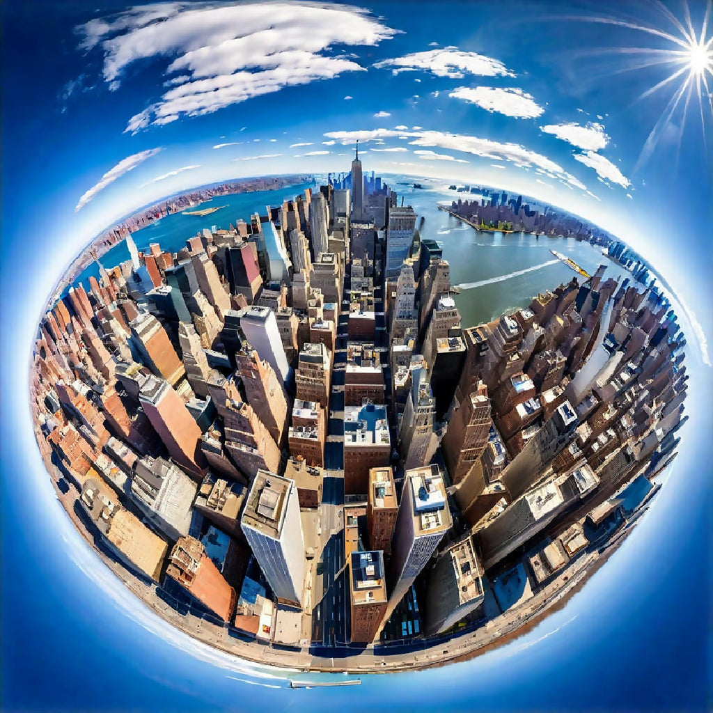 A striking, fisheye-lens views of the Manhattan skyline, giving it an otherworldly appearance. Perfect for anyone who loves the Big Apple.