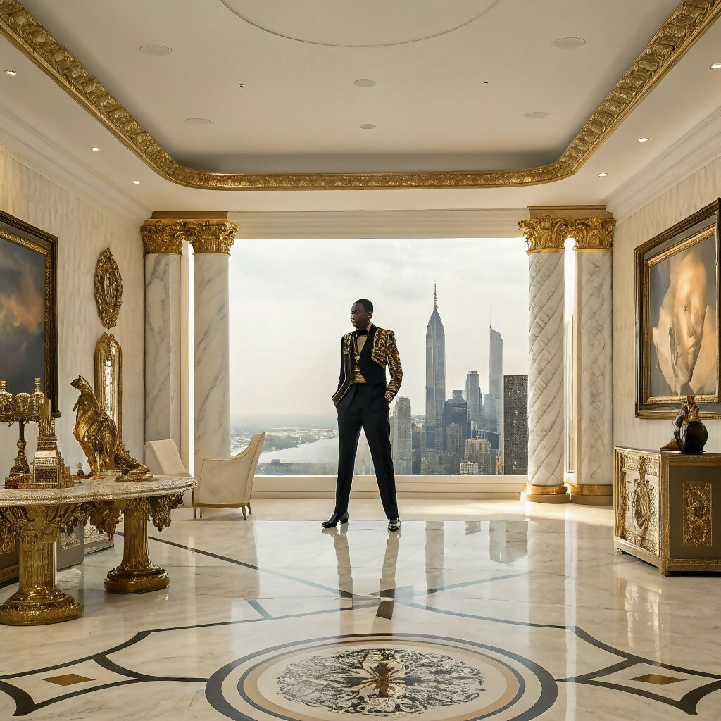 A large, opulent living space, likely an apartment or penthouse, boasts expansive views of the New York City skyline.  The room is predominantly white, with intricate gold-toned moldings and trim accents adorning the walls, ceilings, and pillars.  The walls themselves have a subtle, textured, light cream colour pattern.  Large, decorative, marble columns flank a wide expanse of floor-to-ceiling windows, providing a vista of the cityscape.  A person, dressed in a gold and black jacket and matching trousers, stands in the center of the room.