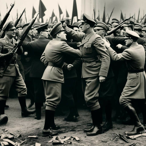 Step into a dramatic reenactment of historical tension with "March of Shadows," a meticulously crafted digital illustration. This artwork captures the fervor and intensity of a military assembly, bringing to life the uniforms, expressions, and atmosphere of a bygone era. The monochromatic tones and dynamic composition evoke a sense of urgency and power, making it a striking piece for history enthusiasts and art lovers alike.