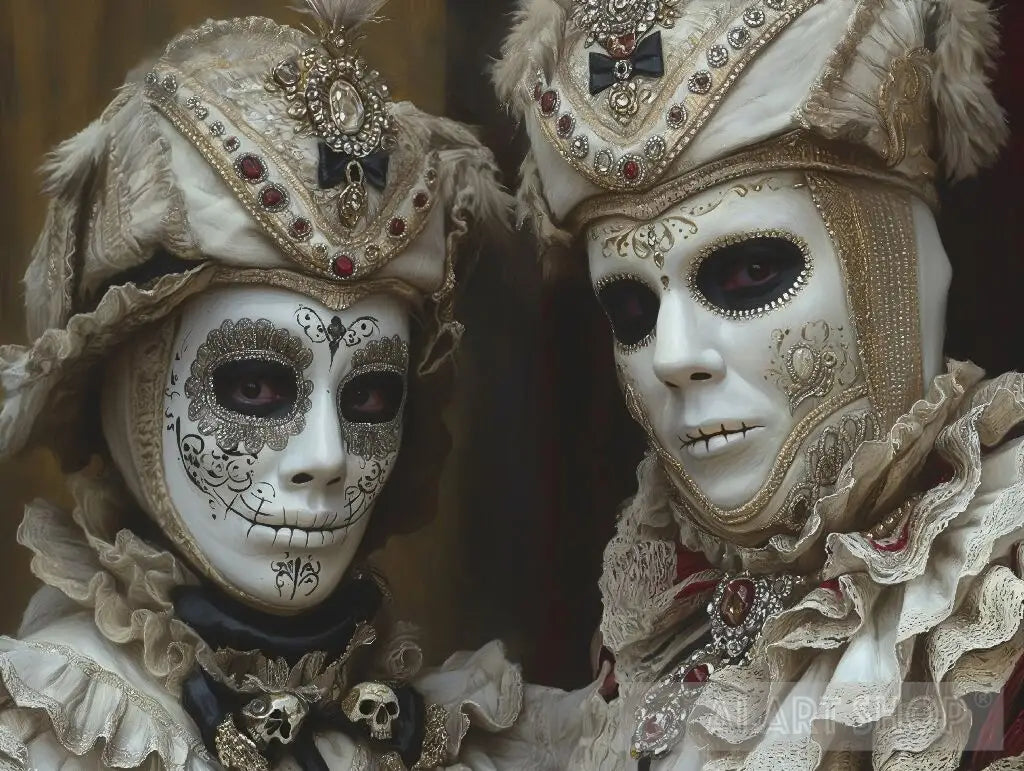 This captivating painting features two intricately dressed figures in elaborate, baroque-inspired masquerade costumes. Their faces are adorned with white masks, each uniquely decorated with ornate patterns, gemstones, and lace, creating an enigmatic and hauntingly beautiful effect. The dark eyes peering through the masks add an air of mystery and intrigue. The rich textures and fine details in their clothing, highlighted with pearls, gold embroidery, and feathered headdresses, showcase the opulence and grandeur of the masquerade. The overall composition evokes a sense of timeless elegance and hidden identities, reminiscent of a grand Venetian ball