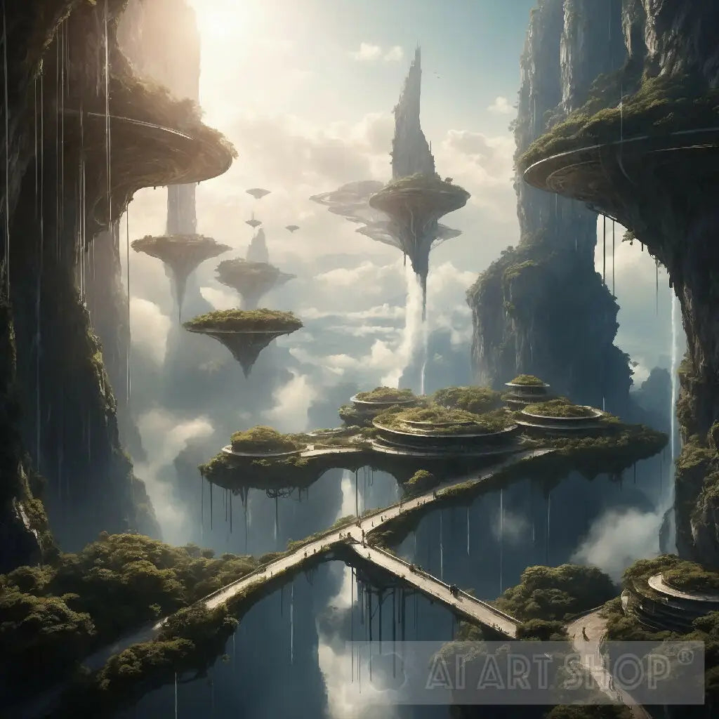 The image depicts a fantastical landscape with towering rock formations and floating islands covered in lush greenery. Waterfalls cascade from the higher structures down into the abyss below. A narrow bridge connects two of these formations, suggesting a sense of adventure or exploration. The scene is shrouded in mist, adding to its mystical and ethereal quality. This image is interesting due to its imaginative concept that combines elements of nature with a surreal, dream-like architecture, evoking wonder and curiosity about the world it represents.