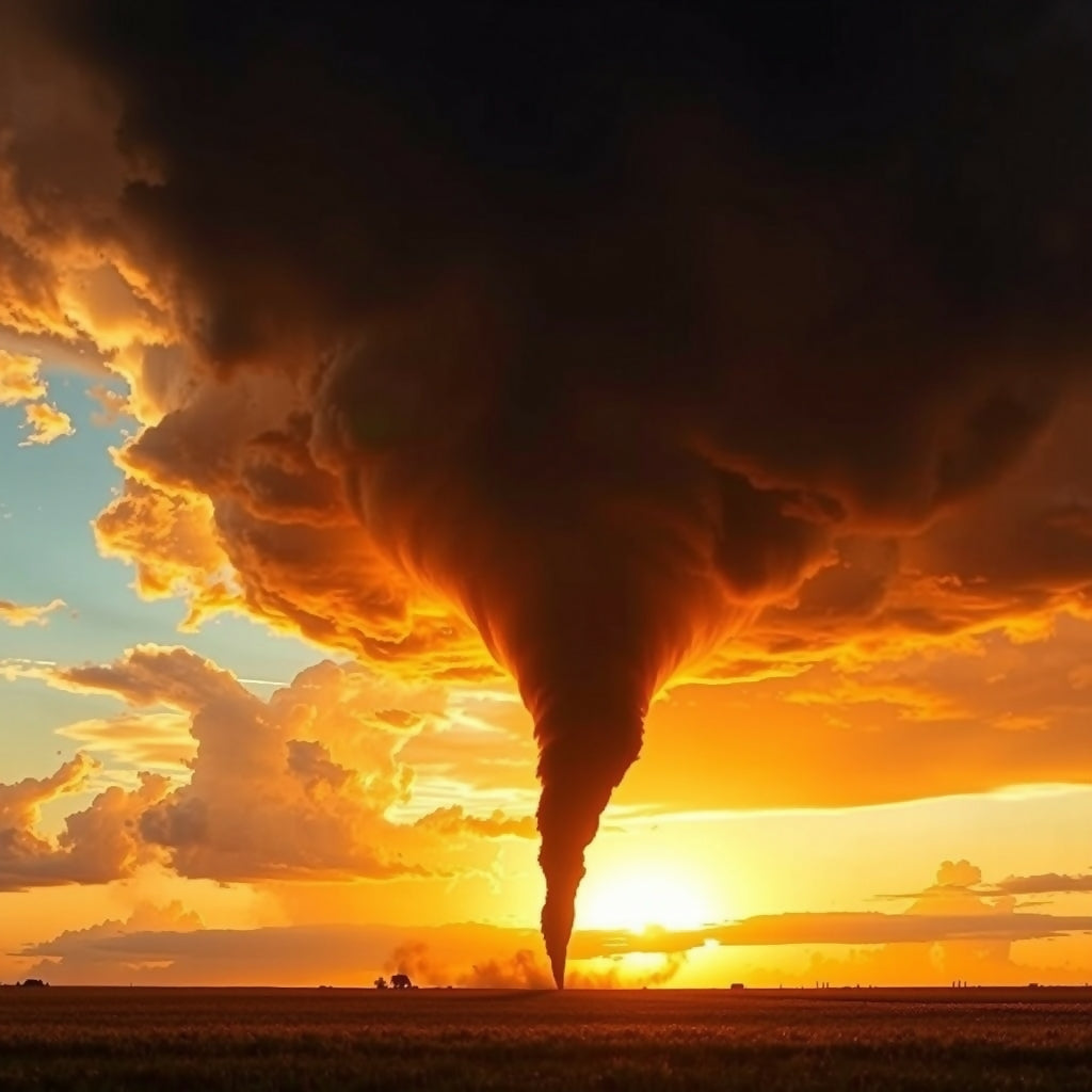 Powerful tornado funnel cloud touching down across open farmland during golden hour. The dramatic twister is backlit by an intense orange and yellow sunset, creating a striking silhouette against billowing storm clouds. The contrast between the dark funnel and luminous sky emphasizes nature's raw power.
