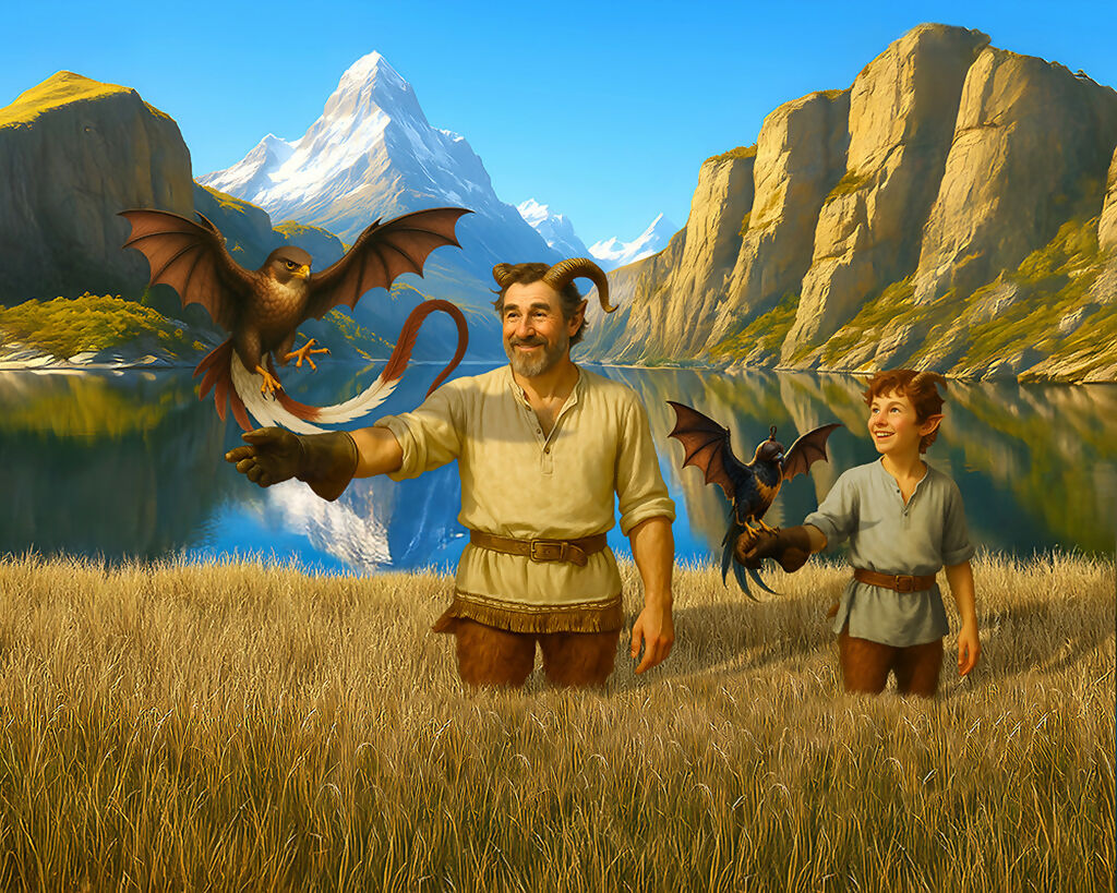 A tender moment between a satyr father and son training their falcon like creatures in a bright mountain valley.