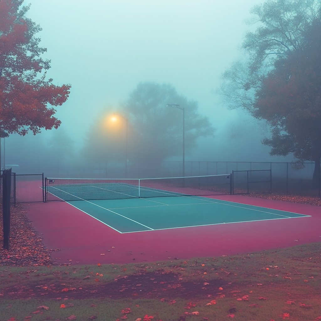 Picture that perfect liminal moment when suburbia reveals its secret beauty—when empty sports courts become theaters of solitude, and pastel fog turns ordinary chain link into cathedral windows. This is nostalgic surrealism at its most tender, channeling the visual language of Wes Anderson meets Gregory Crewdson in your childhood neighborhood.