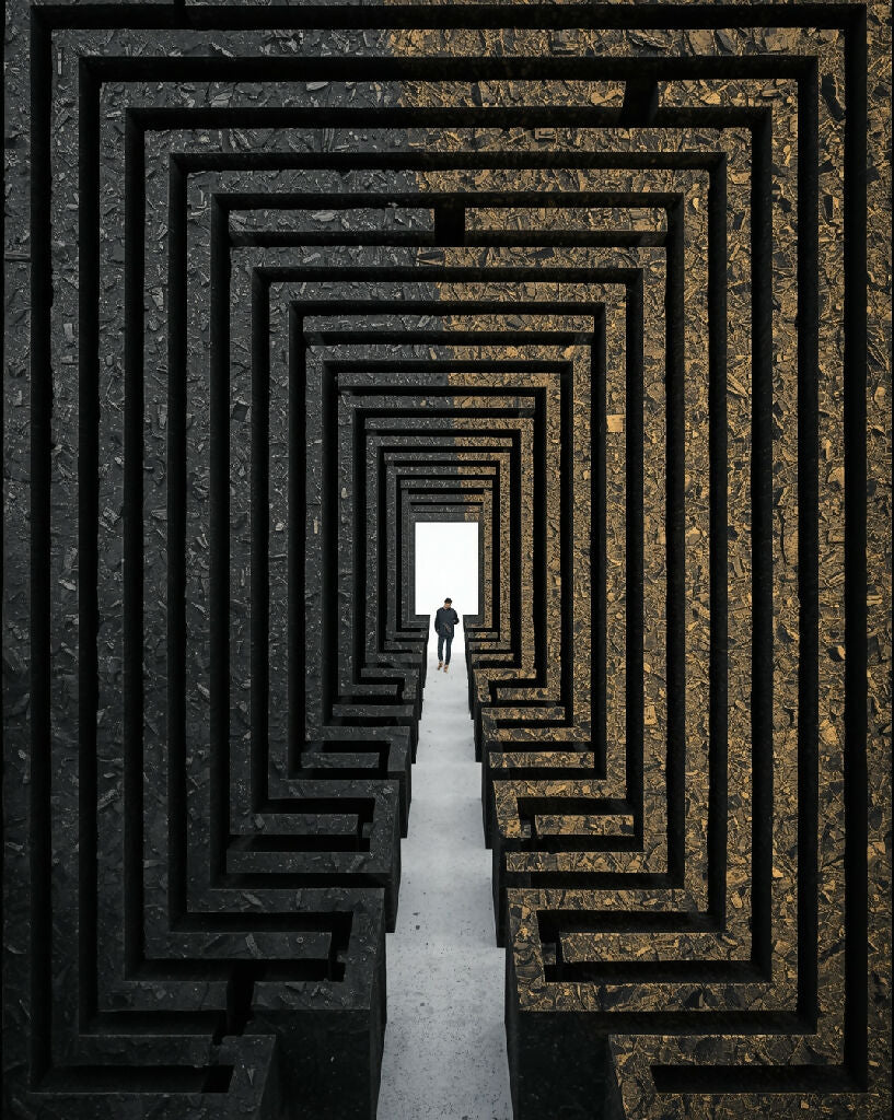 maze, the second img should be in the two sides of the first img and don't repeat the maze image that is the second image agian, blend this once only(that is in the two black areas like a piller or path a door) blend the image naturally and it should feel like its a maze game with some mystrey. in the first image the person and the white space should remain the same . Combine multiple images of objects into a single, harmonious composition. Each object should remain in its original form, Ensure the colors and textures complement each other.