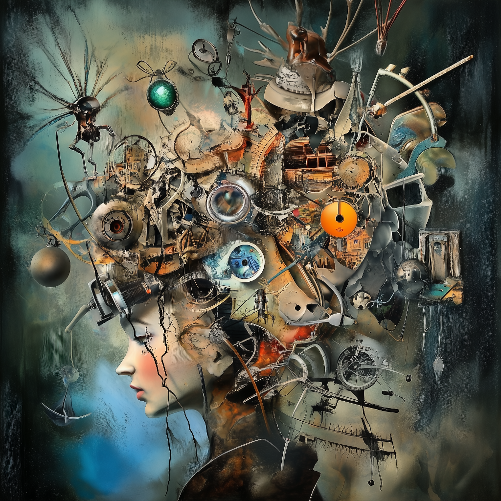 A mind wired for wonder. This surreal AI-generated portrait transforms the human head into a mechanical jungle – bursting with gears, wires, tools, and lost ideas. A chaotic beauty between invention and introspection.