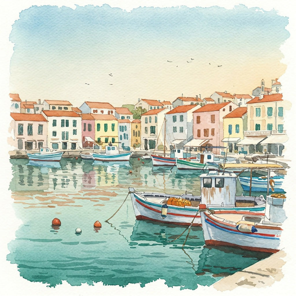This is a beautiful watercolor painting capturing the serene atmosphere of a Mediterranean harbor town. The artwork features light, pastel-toned buildings with characteristic terracotta roofs, vibrant teal shutters, and clean white walls, all reflected gently in the calm teal water filled with colorful boats. The soft edges and hazy atmosphere, typical of watercolor, evoke a sense of tranquility and warmth. Painted in a loose, painterly style, this piece would bring a touch of Mediterranean charm and artistic elegance to any space.