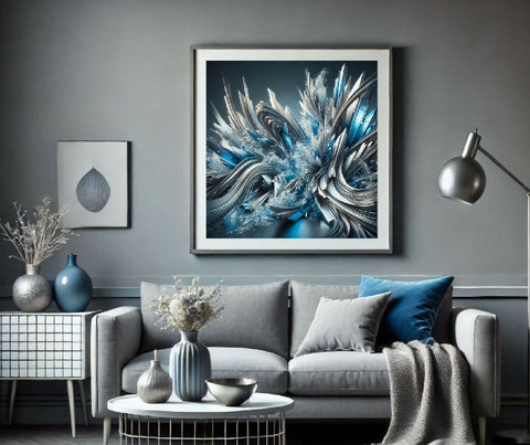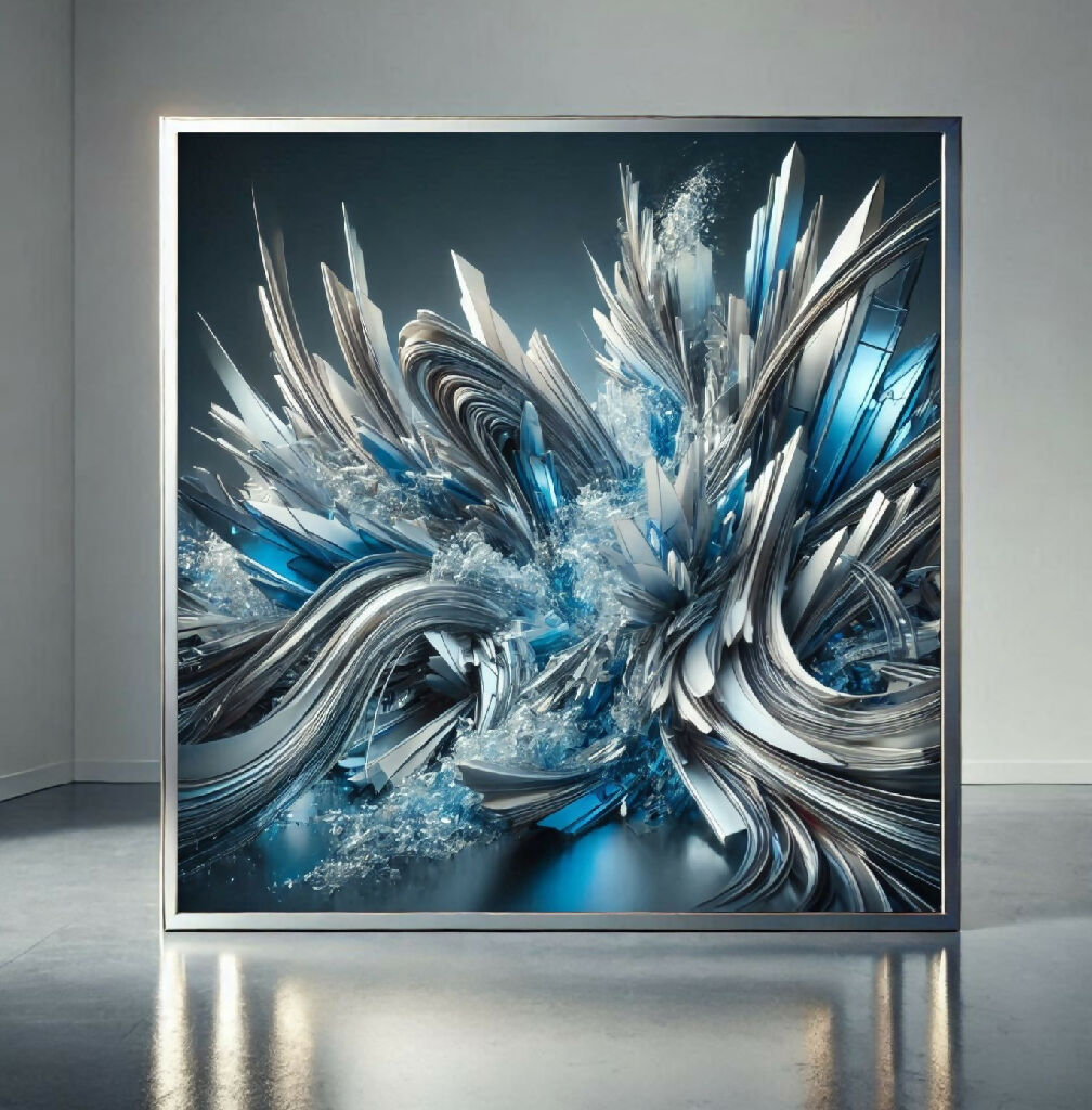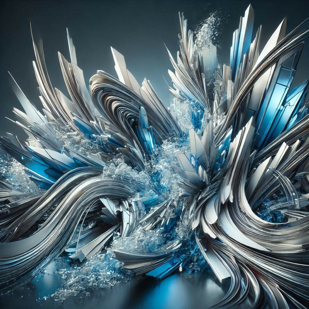 Eine Explosion aus metallischen, bandartigen Formen in Silber- und Blautönen. Die Formen sind dynamisch und scheinen sich zu bewegen oder zu fließen, mit einigen Elementen, die an sprudelndes Wasser erinnern. Der Hintergrund ist dunkelgrau, was den metallischen Elementen des Vordergrunds Kontrast verleiht. Das Bild wirkt modern.