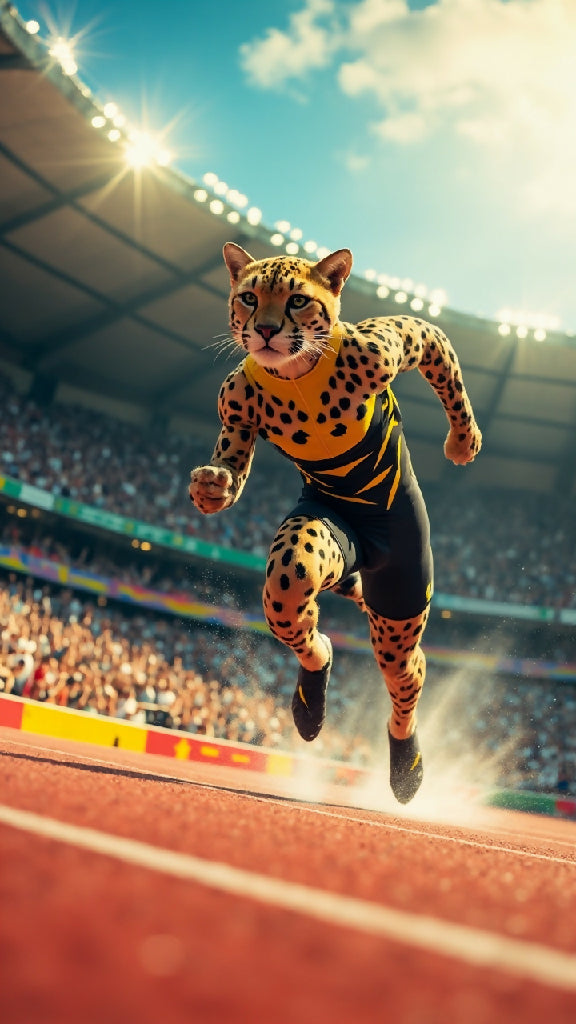 Meet Chita, the lightning-fast half-cheetah, half-human sprinter! 🐆👟​ In this AI-crafted art, Chita blazes down the track in a packed stadium 🏟️, clad in sleek athletic gear that complements her spotted fur. With every powerful stride, she leaves competitors in the dust, embodying the pinnacle of speed and agility. The crowd erupts as she crosses the finish line, showcasing the perfect fusion of animal instinct and human determination.​ Experience the thrill of the race and the marvel of AI creativity in this electrifying art!