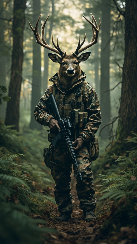 In this AI-crafted art, witness a majestic half-deer, half-human hunter blending seamlessly into the forest. With towering antlers and keen eyes, he's clad in high-tech camouflage, stalking through the wilderness with precision. Armed with a sleek rifle, he embodies the perfect fusion of nature and technology.