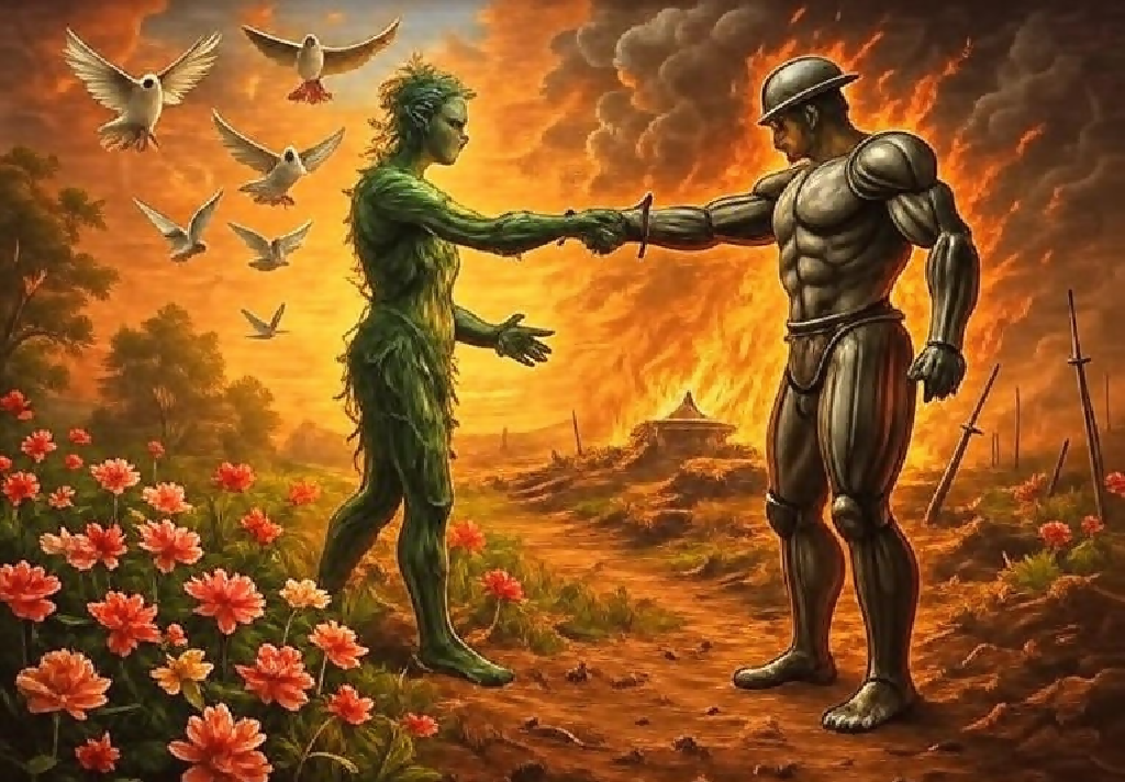 "In the midst of a surreal battlefield, two giant figures—one made of light and vines, the other of steel and flames—shake hands, symbolizing a dramatic harmony between hope and destruction. This painting blends the beauty of flowers and a radiant sunrise with the scars of fire and weapons, inviting reflection on the balance between nature and conflict."