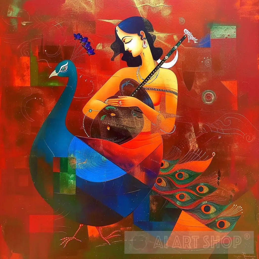 Symphony of Women and Peacock" is a vibrant tableau capturing the essence of Indian culture. Against a backdrop of rich blues and lush greens, graceful women in colorful saris move with elegance, while a majestic peacock, resplendent in iridescent hues, stands proudly at the center. This captivating painting is a celebration of beauty, tradition, and the harmonious relationship between nature and humanity in India.