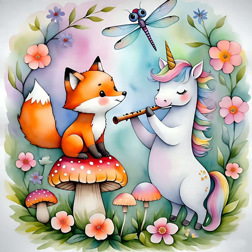 Step into a world where music awakens magic and friendship blooms between unlikely companions. “Melody of the Enchanted Grove” captures a surreal moment deep within a mystical forest, where a golden-horned unicorn serenades the twilight with a flute, and a curious fox listens from atop a giant mushroom. Surrounded by vibrant flora and fluttering dragonflies, this AI-generated artwork invites viewers to imagine a realm where nature and fantasy harmonize. Perfect for dreamers, storytellers, and collectors of the extraordinary.