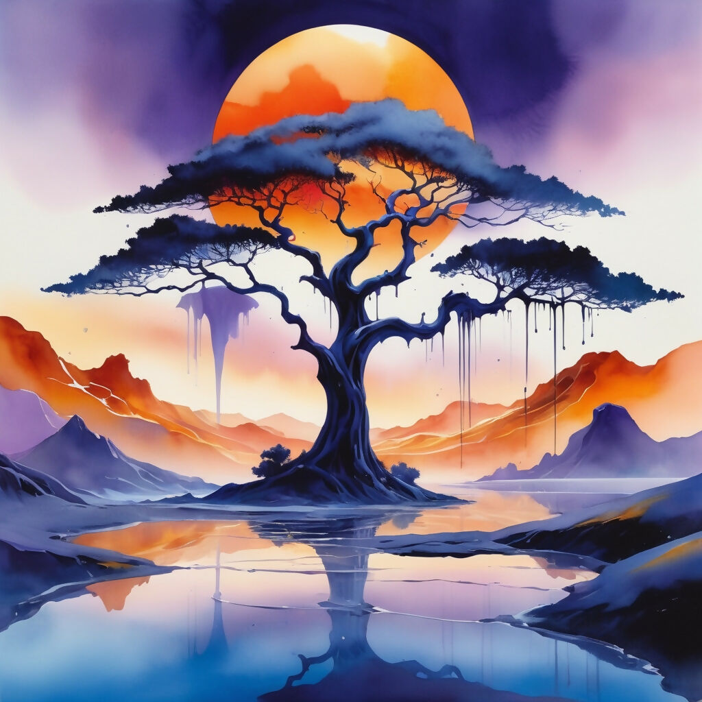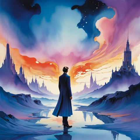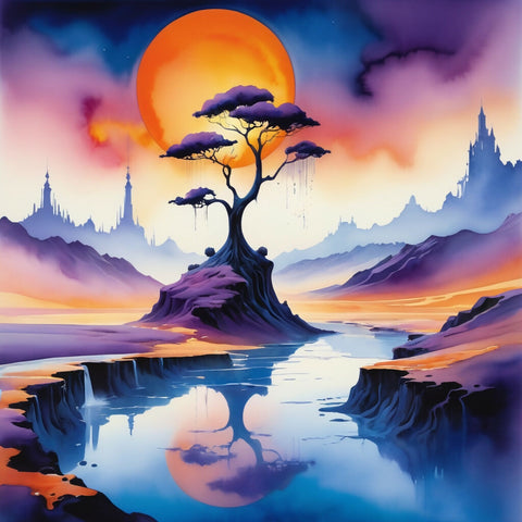 In the foreground, elements of the scene—perhaps a lone tree, a streetlamp, or a quiet bridge—seem to melt into liquid puddles of blues, pinks, and golds, reflecting an ethereal glow. Shadows stretch and twist unnaturally, and reflections ripple across glossy, paint-like surfaces. The use of wet-on-wet techniques enhances the dreamlike fluidity, while delicate ink or fine brush details add definition to surreal structures dissolving into color. The painting captures a fusion of Salvador Dalí-inspired surrealism with the soft, flowing unpredictability of traditional watercolor techniques.*