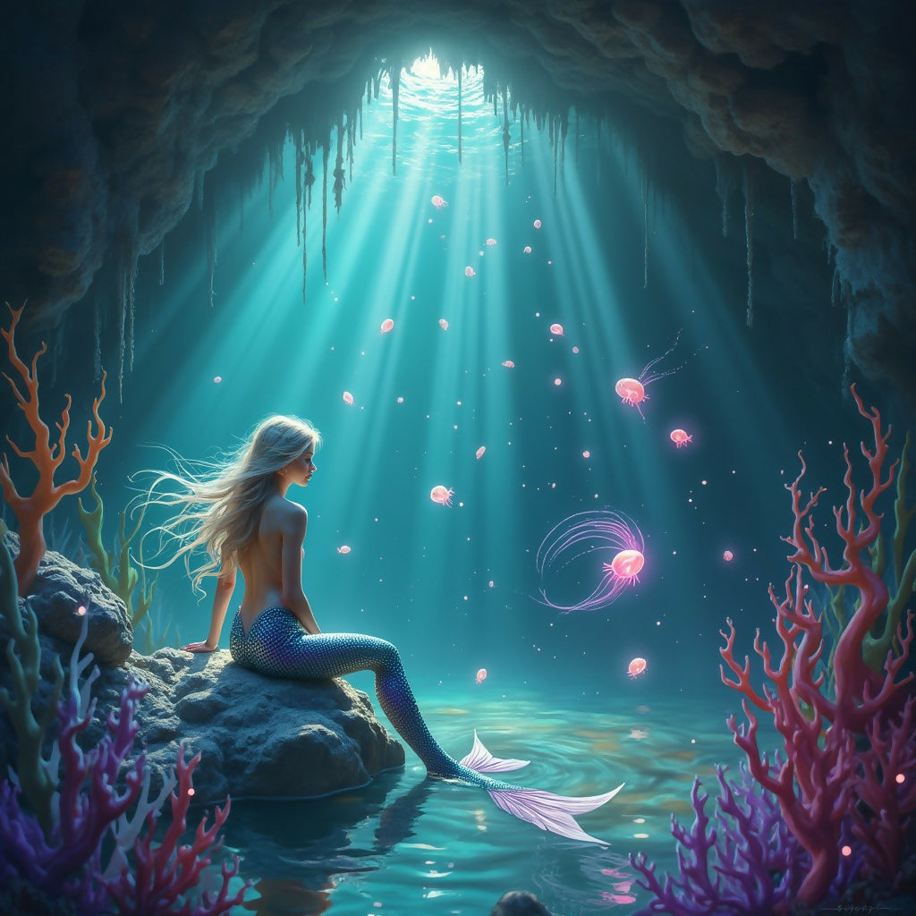 She rests gracefully on a rock, surrounded by a dreamy underwater world of coral reefs, luminous jellyfish, and soft rays of light piercing through the ocean surface above. Her expressive eyes hold a mix of mystery and allure, embodying the timeless charm of the sea’s most magical creature. Perfect for those who adore oceanic fantasy and ethereal beauty.