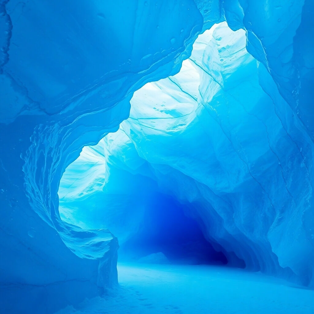 Breathtaking interior of a glacial ice cave featuring ethereal blue tones and dramatic natural ice sculptures. Smooth, curved walls create an otherworldly tunnel effect, while light filters through the translucent ice creating luminous turquoise and sapphire hues. A stunning example of nature's artistic power in frozen landscapes.