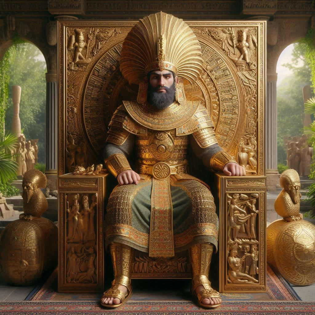 Step into a world of ancient grandeur and timeless power with this breathtaking digital artwork. Featuring a regal emperor seated upon an intricately crafted golden throne, this masterpiece blends elements of Persian, Mesopotamian, and Egyptian aesthetics to portray the divine authority of a legendary ruler. His shimmering armor, radiant crown, and stoic gaze embody strength, wisdom, and immortality.