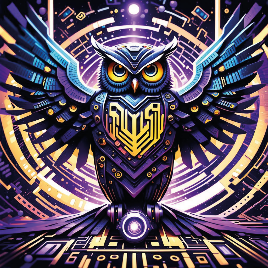 This cutting-edge design features a futuristic owl with mechanical wings and glowing LED eyes, soaring through a digital landscape of binary codes and circuit patterns. The owl’s body is a seamless blend of metallic armor and digital textures, giving it an ethereal yet mechanical presence. The background is filled with lights and data streams, representing a world where nature and technology collide in an infinite virtual sky.