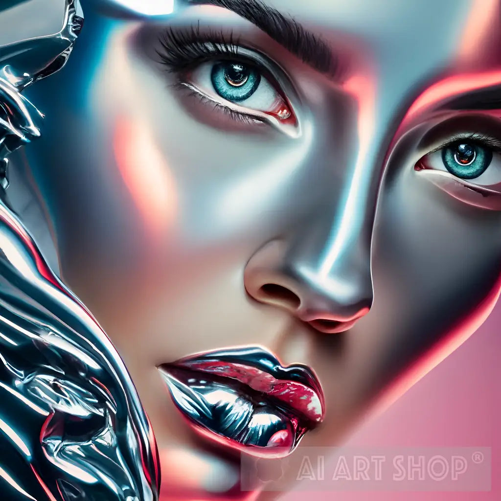 liquid metal chrome wall carbonited with a liquid metal chrome girl, raw photo, real