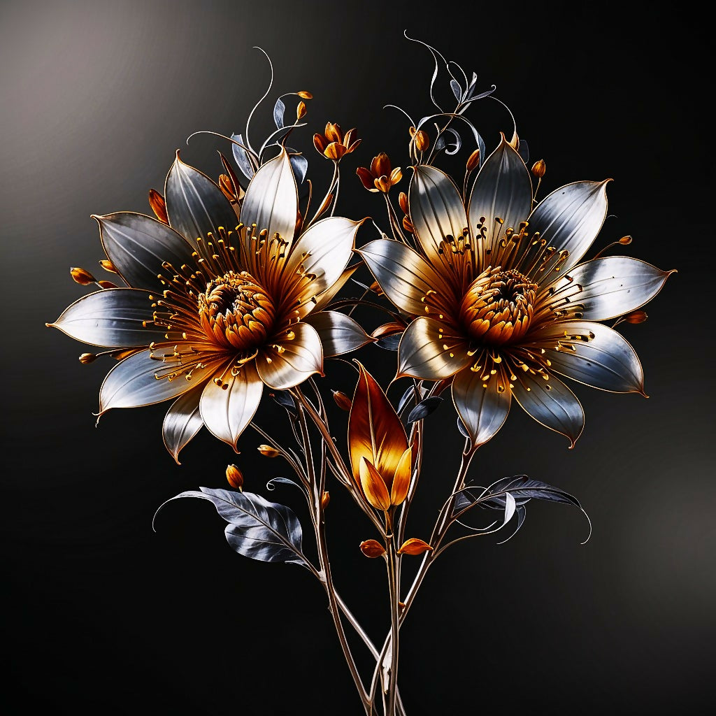 An elegant floral masterpiece featuring luminous metallic petals in golden and silver hues. This refined composition merges organic beauty with futuristic elegance, making it a standout piece for sophisticated interiors and digital art collections.