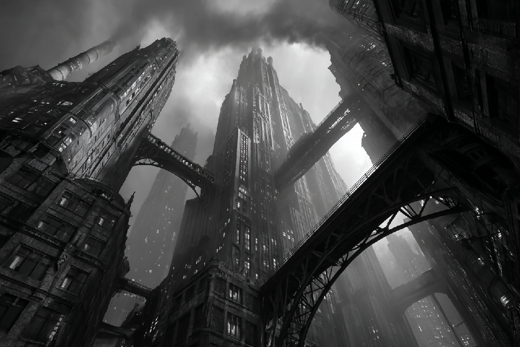 Tags: urban, dystopia, skyscraper, fog, architecture, monochrome, surreal, vertical, cityscape, aiart