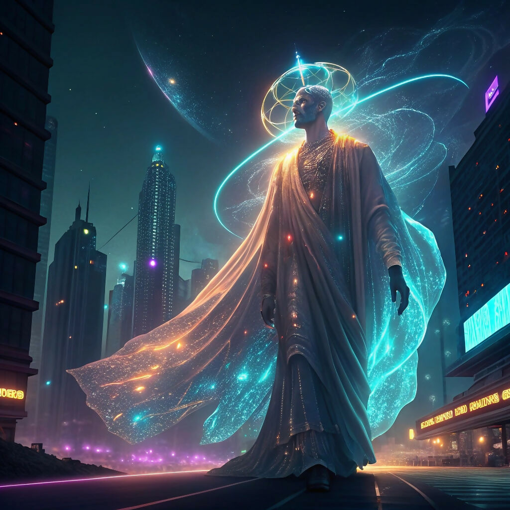 A man dressed in a long robe is walking along a city street at night. The surroundings feature tall skyscrapers illuminated by bright lights, creating a vibrant outdoor atmosphere.