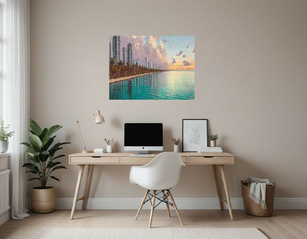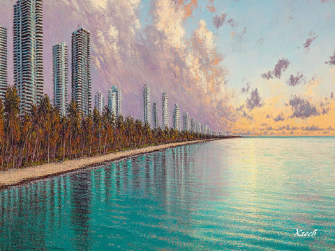 The painting depicts a coastal cityscape of Miami at dawn or dusk, rendered in a textured, impressionistic style. Tall, modern skyscrapers dominate the left side of the composition, their vertical lines stark against the soft hues of the sky. A line of trees runs along the shore, their foliage depicted with warm browns and greens. The sky transitions from a pale blue to a warm orange and pink as it meets the horizon, with puffy clouds adding depth and texture. The water is a serene turquoise, reflecting the colors of the sky and subtly mirroring the city skyline. The overall mood is tranquil and serene, capturing the beauty of a coastal city at a peaceful moment in time. The thick application of paint and visible brushstrokes create a sense of movement and vibrancy throughout the scene.