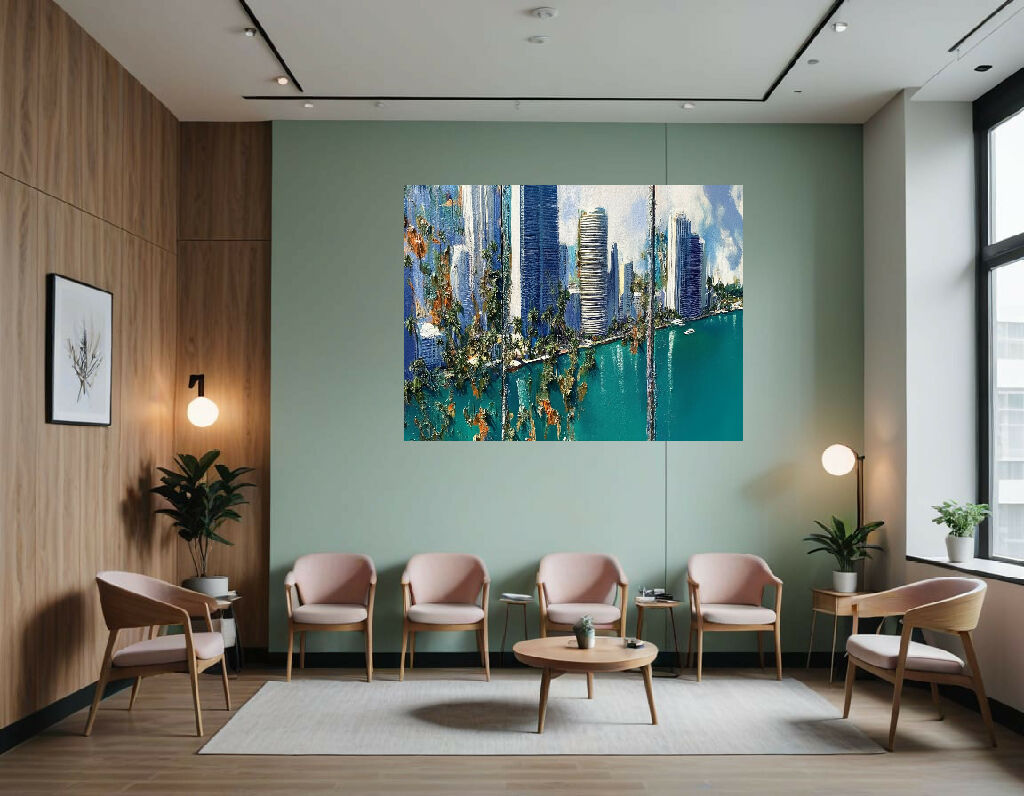 This painting is a vibrant and textured cityscape of a waterfront skyline, likely inspired by a city such as Miami. The artist uses thick, expressive brushstrokes and impasto techniques, giving the scene a sense of lively movement and depth. Tall, modern skyscrapers—some with rounded facades and others with dramatic vertical lines—rise along the shore, their surfaces catching highlights of white, blue, and hints of yellow.