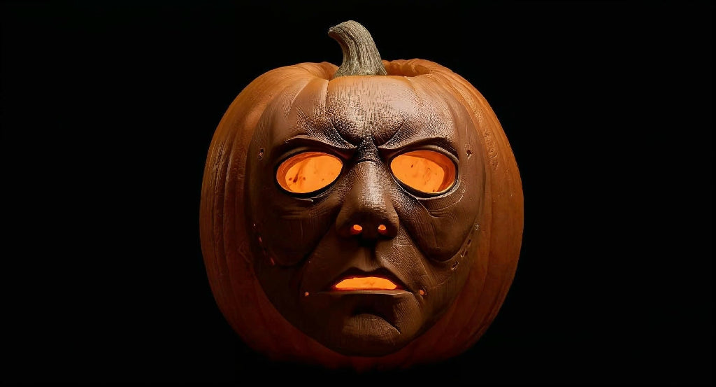 Nicely detailed jack o lantern carved in the likeness of movie monster Michael Myers.