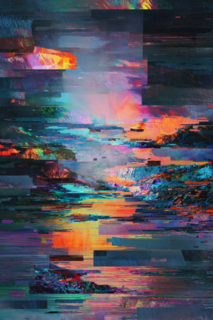 Style: abstract digital blending geological microscopy with glitch and surreal landscape aesthetics