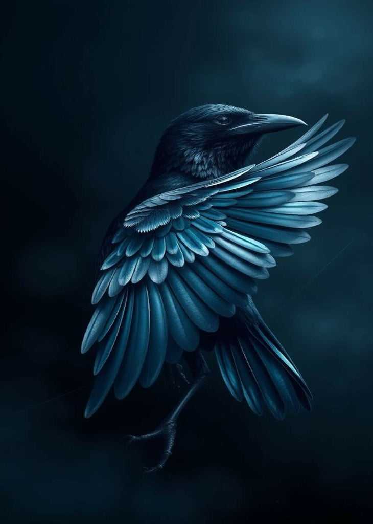 “Midnight Flight captures the enigmatic beauty of a crow in shades of deep blue and indigo. Its shimmering feathers glisten with subtle metallic highlights, creating a striking contrast against the dark, moody background. The design evokes mystery, elegance, and a touch of the ethereal, making it a perfect centerpiece for any modern or contemporary space. Printed on high-quality metal, this artwork brings depth, texture, and a luminous effect that changes with the light, giving your walls a dynamic, captivating presence.”