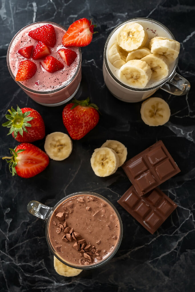 Milkshakes in clear glass cups, one with fresh strawberries mixed with strawberries and sliced ones next to it, one with ripe bananas mixed with banana slices, one with mixed rich chocolate, with a chocolate slice next to it. All against a black marble background.