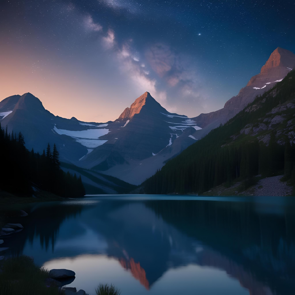 A stunning digital landscape of a tranquil mountain lake at dusk, with the majestic peaks illuminated by the last light of day and the Milky Way arching gracefully overhead. The reflection in the still water mirrors the serene grandeur of the scene, evoking a peaceful and awe-inspiring connection to nature.