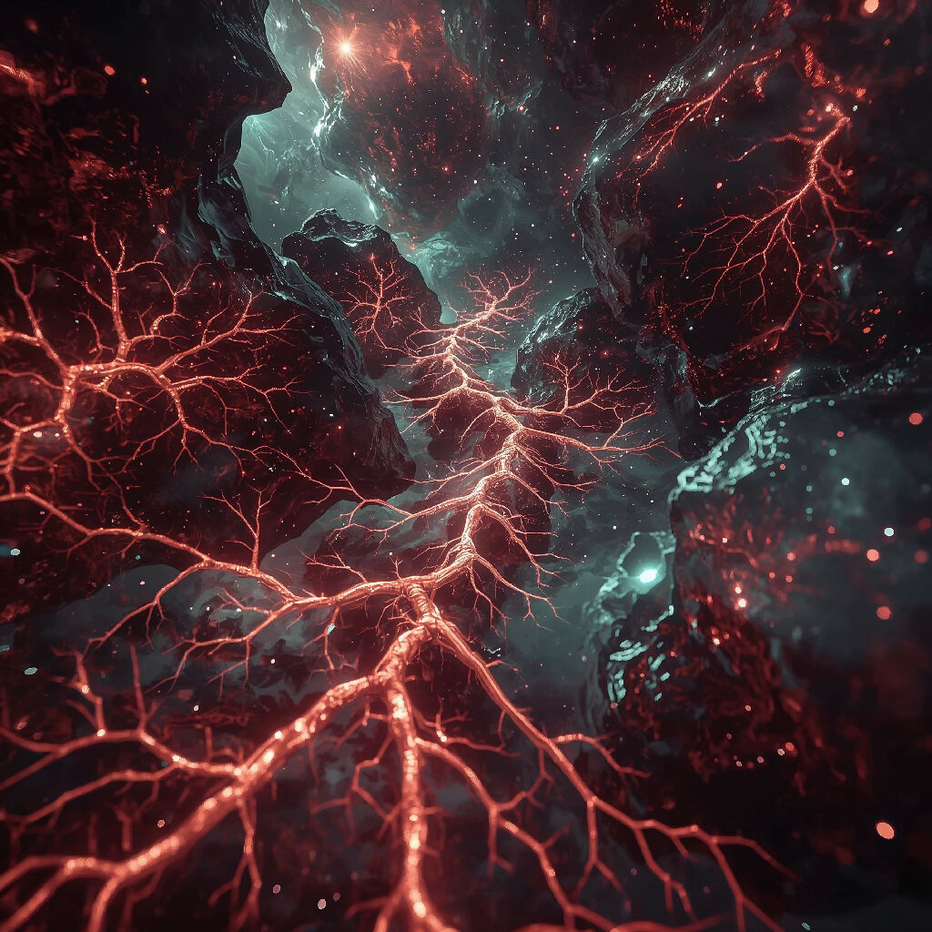 Branching networks of coral-red dendrites spread through aqueous space, their organic architecture suggesting both neural pathways and arterial systems. Teal crystalline formations provide counterpoint to the warm, living structures, creating a dialogue between biological and mineral realities. The composition's depth and layering evoke microscopic and macroscopic scales simultaneously, equally suggesting the interior landscape of consciousness and vast cosmic nebulae. Bioluminescent particles drift through the scene like synaptic signals or celestial bodies. This work explores the profound interconnectedness between thought, flesh, and the universe's fundamental structures.