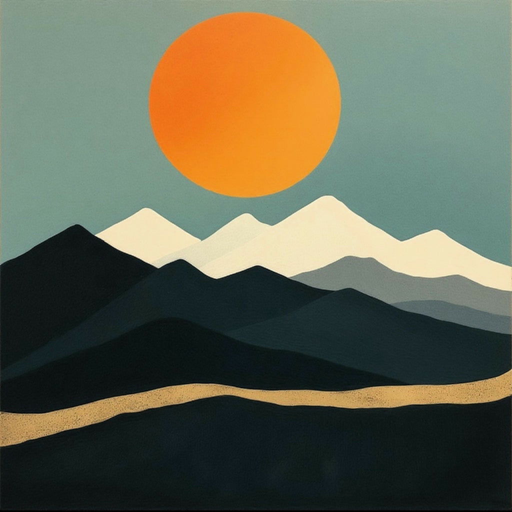 A minimalist landscape painting depicting a vast, radiant orange sun dominating a tranquil blue-green sky. Below, a series of abstract mountain peaks in cool shades of blue and grey recede into the distance.
