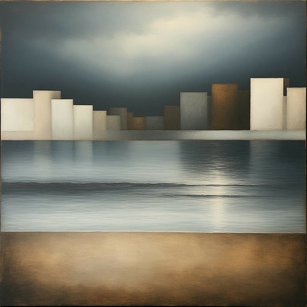 An Ai painting showcasing an abstract city skyline across tranquil waters, set against a brooding, cloudy sky. The geometric forms and subdued color palette create a powerful sense of calm and introspection.